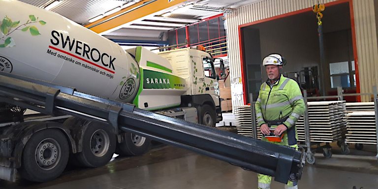 Vi erbjuder ett antal hybrida betongbilar. De här bilarna kör helt och hållet på el när betongen lossas och drivs då av ett batteri. En hybridbetongbil passar bra vid inomhusgjutningar då de ger en förbättrad arbetsmiljö.