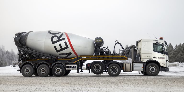 Trailerbilar är större än en vanliga betongbilar och kan lasta upp till 11,5 kubikmeter betong. Det här gör att vi kan minska antalet transporter och därmed även minska utsläppet av koldioxid. Kontakta din lokala betongfabrik för att se om det finns trailerbilar tillgängliga till ditt projekt.