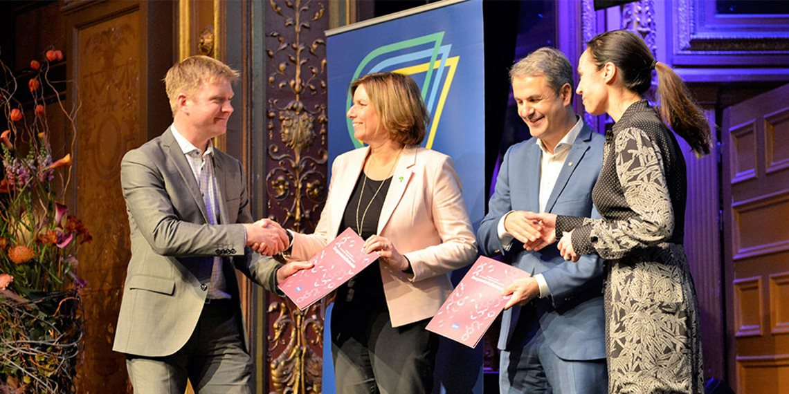 SBMI:s vd Mårten Sohlman och styrelseledamot Erika Nobel överlämnar bergmaterialindustrins färdplan till miljö- och klimatminister Isabella Lövin samt näringsminister Ibrahim Baylan.