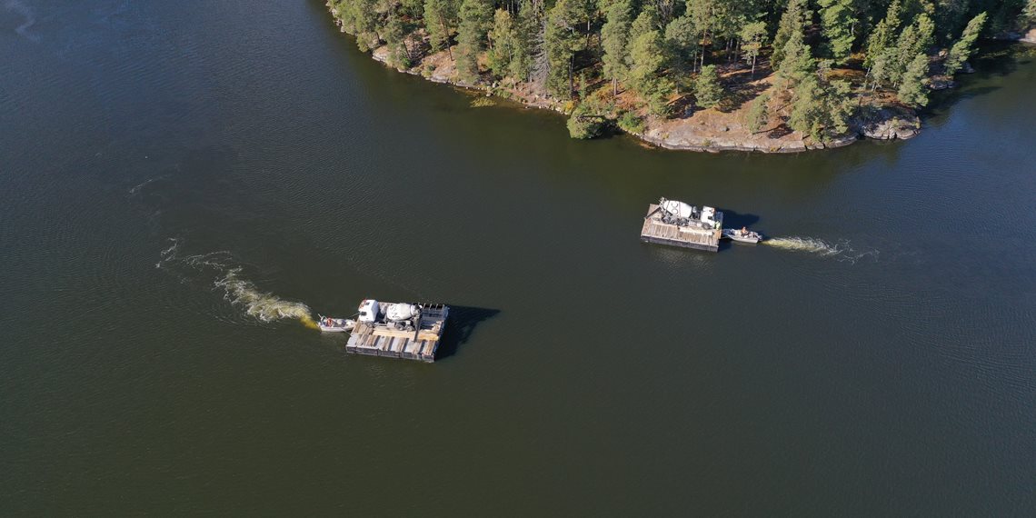 För att förbinda Alby naturreservat och Tyresta naturreservat och nationalpark i södra Stockholm bygger Peab just nu en gångbro över Nyforsviken. För att undvika skador på naturen gjöts landfästena till bron ifrån vattnet. Det innebar att våra betongbilar fick fraktas till platsen på stora pontoner.