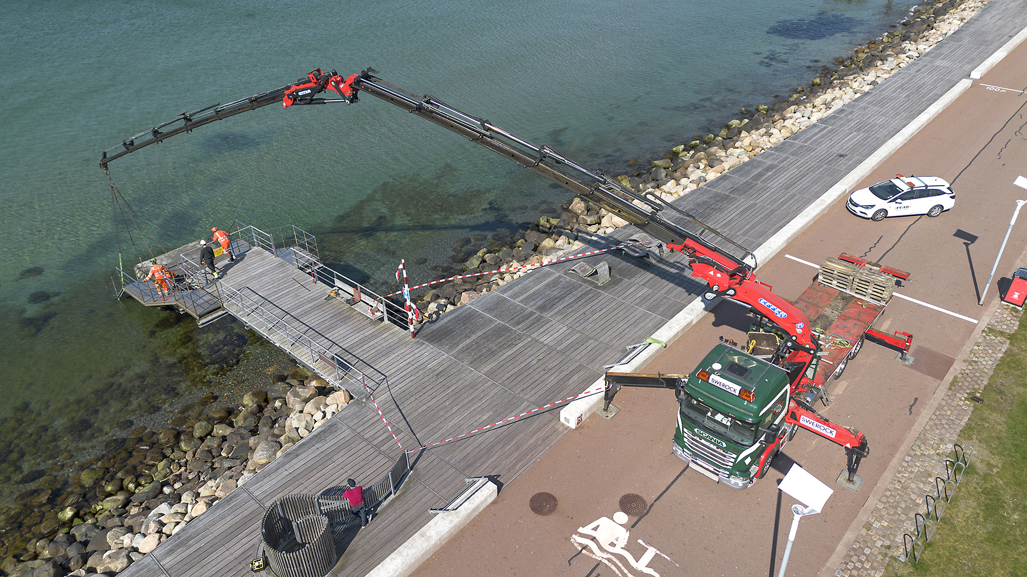 Med hjälp av Swerocks kranbil kunde trapporna lossas och lyftas säkert från flaket till rätt position, cirka 28 meter ut på bryggan. Där monterades de av personal från Peab så att alla badsugna enkelt kan ta ett dopp i havet.