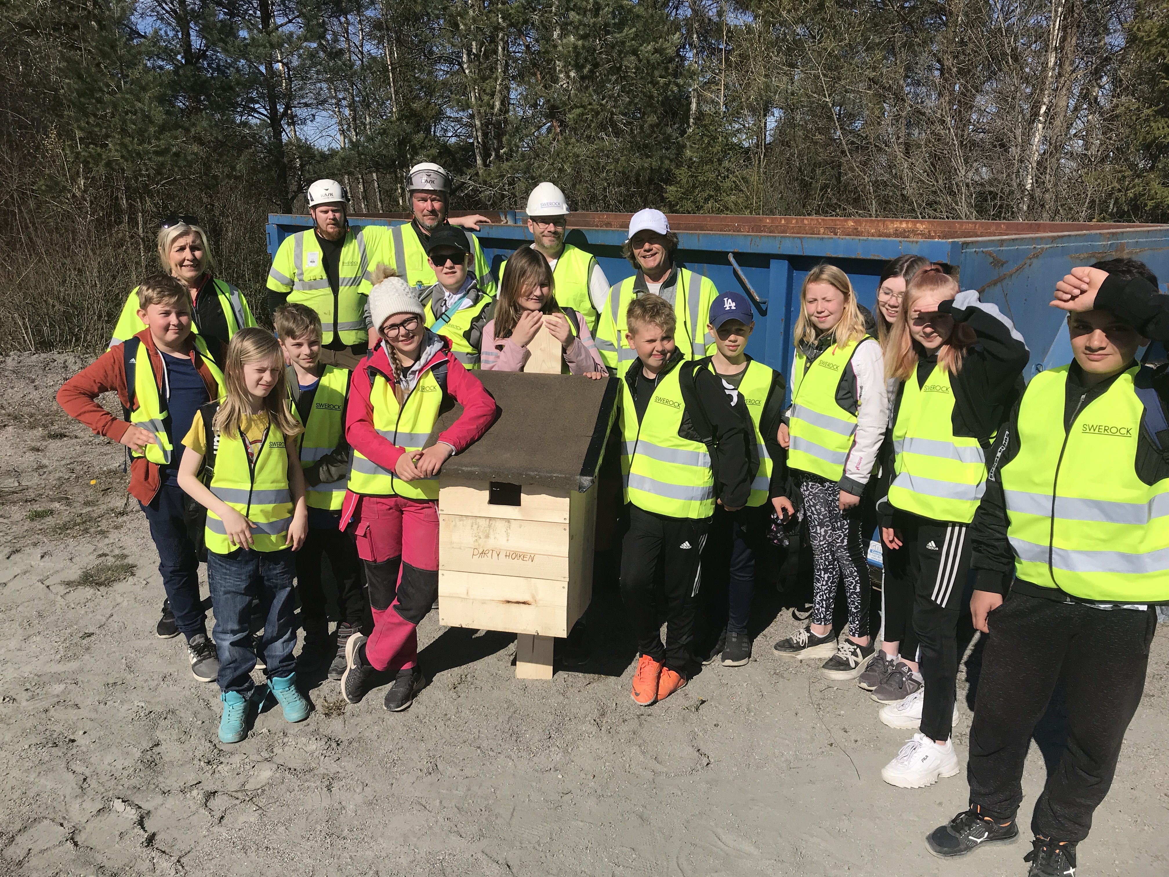 Eleverna på Frändeskolan i Frändefors har läst om fågelarter, fladdermössarter och insekter på Naturkunskapen. I slöjden har de tillverkat holkar till flera fågel- och fladdermusarter. I dag var det dags att sätta upp dem i vår bergtäkt i Vänersborg. Där vill man främja mångfalden gällande växter och djur på arbetsområdet.